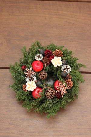 プリザーブドグリーンをベースに、木の実やりんご、リボンなどを自由に飾り付けて楽しむ、直径約15cmのミニリースキットです。